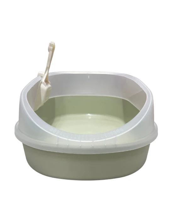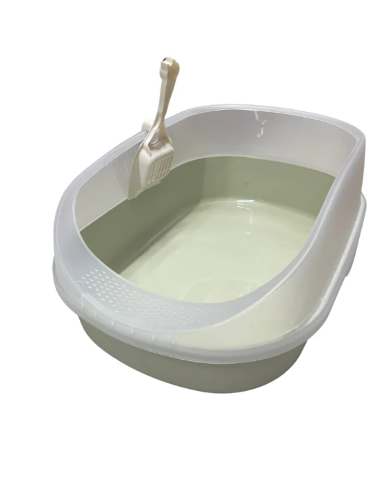 ארגז שירותים שקוף בצבע ירוק, נוח לשימוש וקל לניקוי, מספק פרטיות ונוחות לחתול.