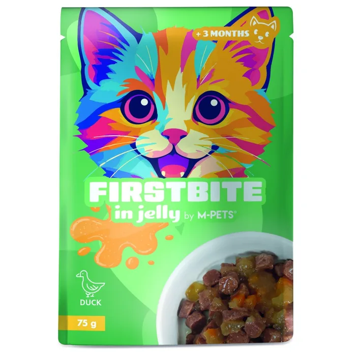 FirstBite בג'לי בטעם ברווז הוא מזון רטוב לחתולים במרקם רך ועסיסי, שמעניק חוויית אכילה טעימה ומזינה.