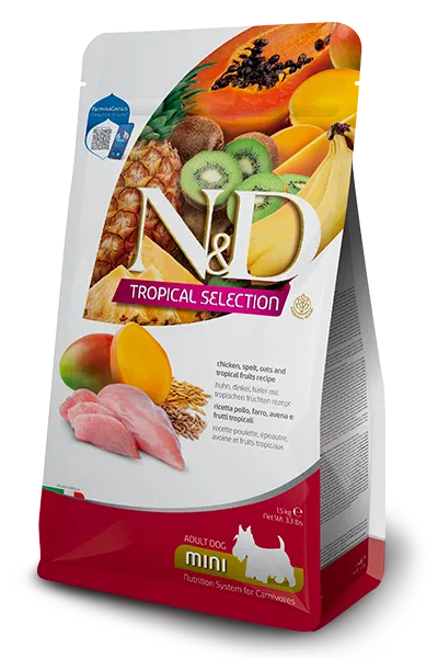 מזון יבש איכותי מבית Farmina N&D, עם עוף טרי, פירות טרופיים ודגנים מלאים – מותאם במיוחד לכלבים בוגרים מגזע קטן.