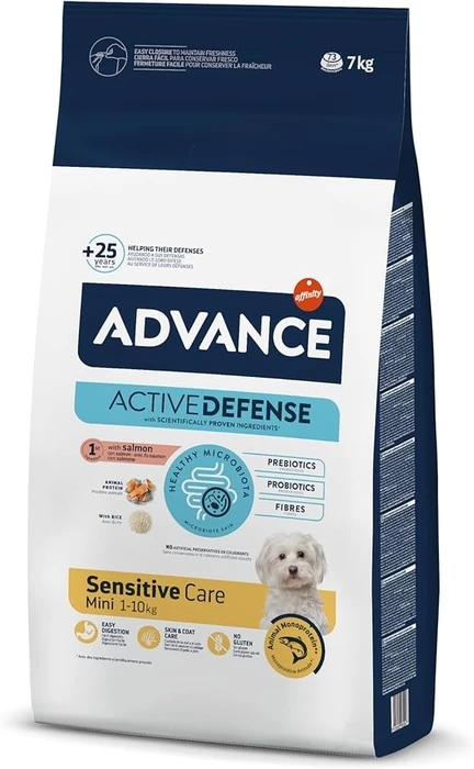 ADVANCE Sensitive Small Breed הוא מזון סופר פרימיום שתוכנן במיוחד עבור כלבים רגישים מגזעים קטנים. הפורמולה מבוססת על סלמון כרכיב עיקרי – מקור חלבון קל לעיכול וטעים במיוחד, שמתאים גם לכלבים בעלי קיבה רגישה או נטייה לאלרגיות.